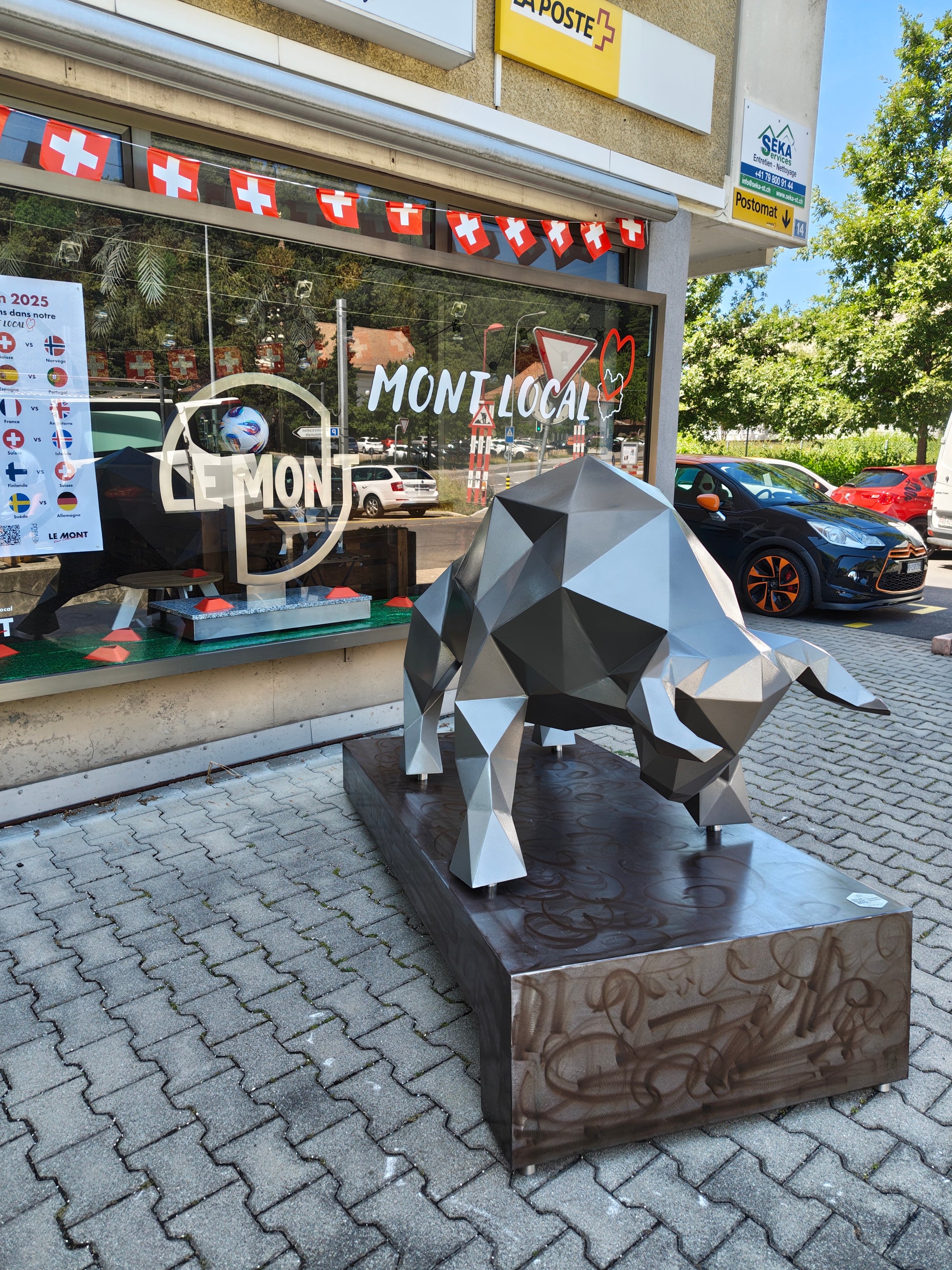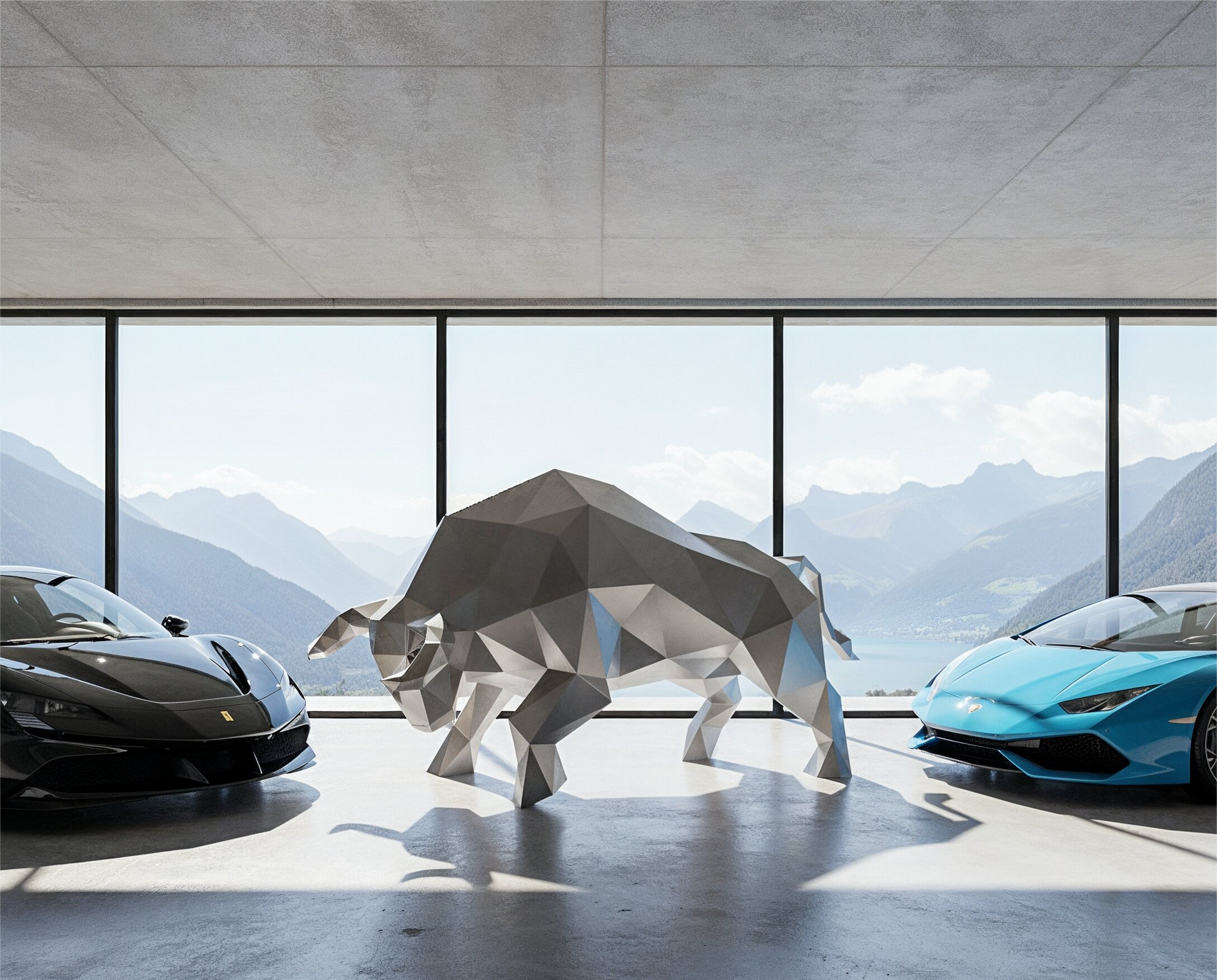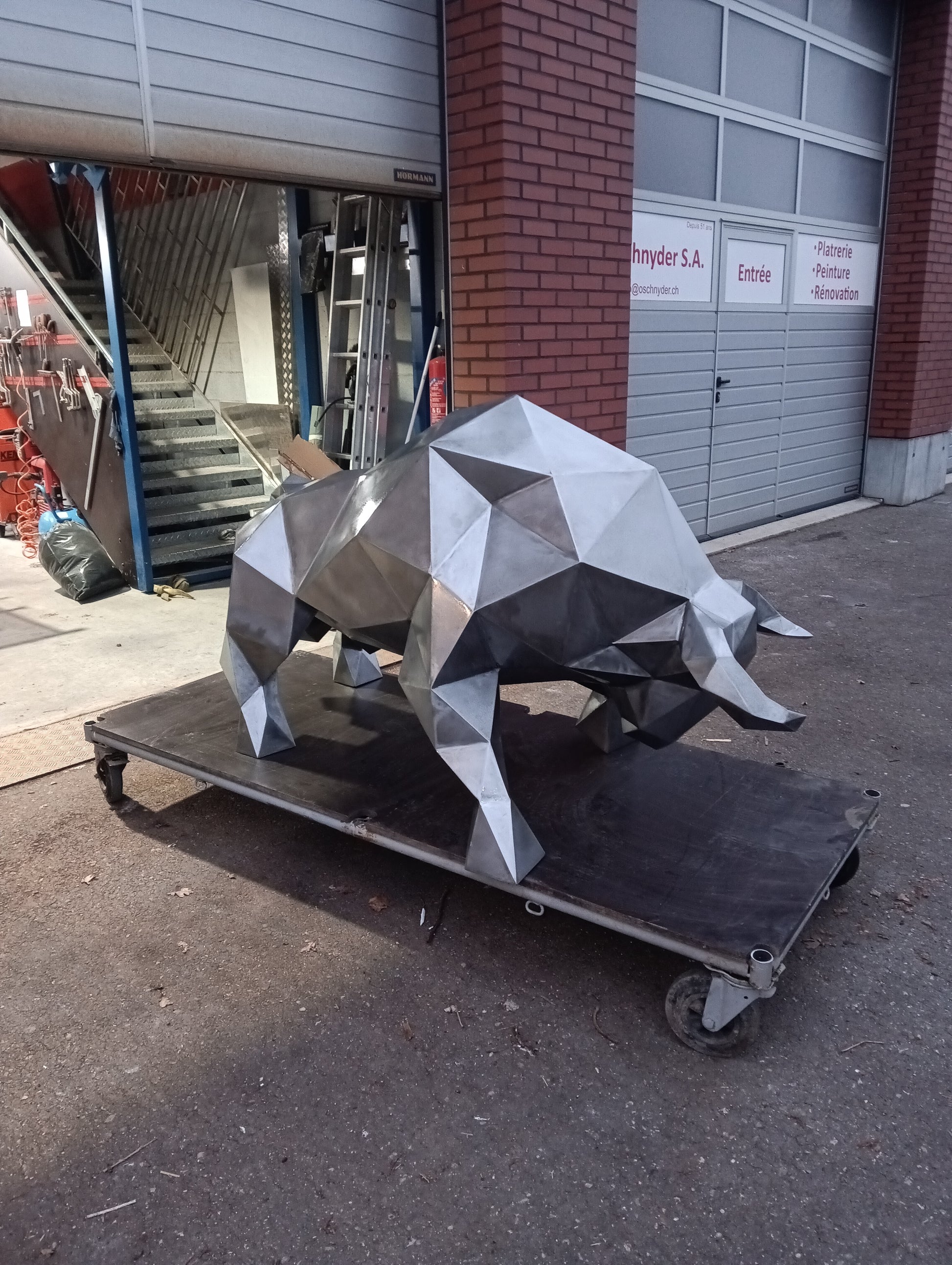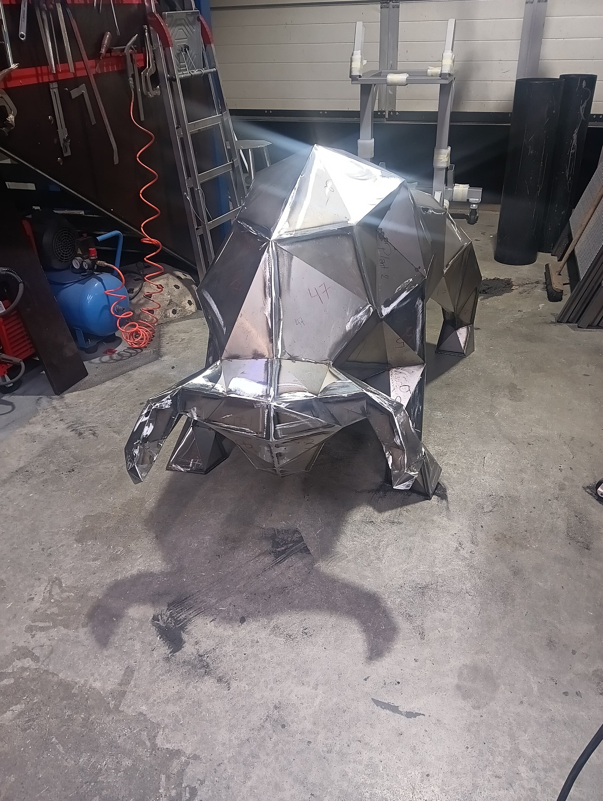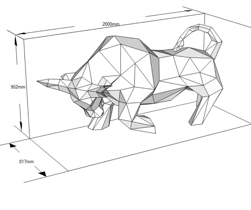 Cette sculpture polygonale de taureau a été créée en tôle d'acier, découpée au laser, pliée avec maîtrise, soudée et polie avec différents finis qui exaltent sa force géométrique. Les lignes facettées évoquent une énergie contenue et de la détermination.