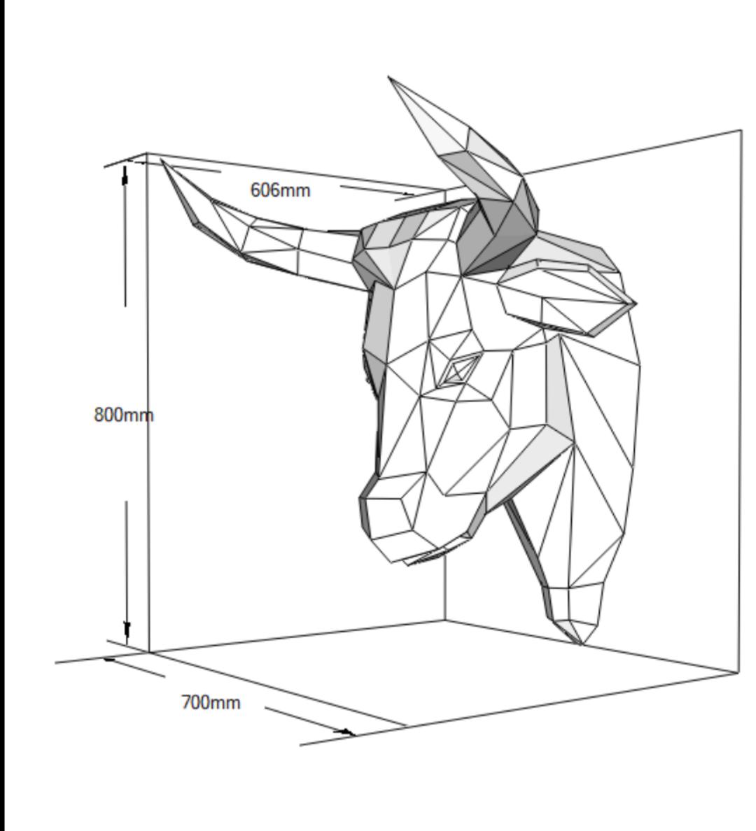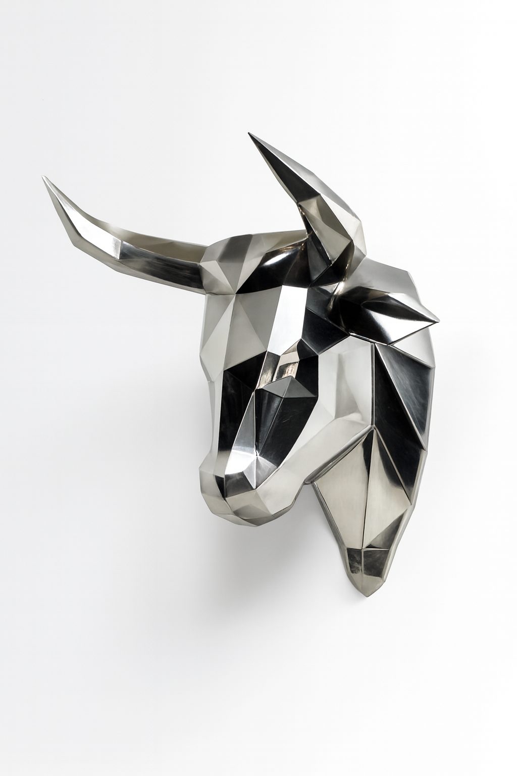 Cette sculpture polygonale de tête de taureau a été conçue en tôle d'acier, découpée au laser, pliée, soudée et polie dans différents finis qui mettent en valeur ses lignes facettées. Son design concentre toute la force de l'animal dans un portrait métallique de caractère intemporel.