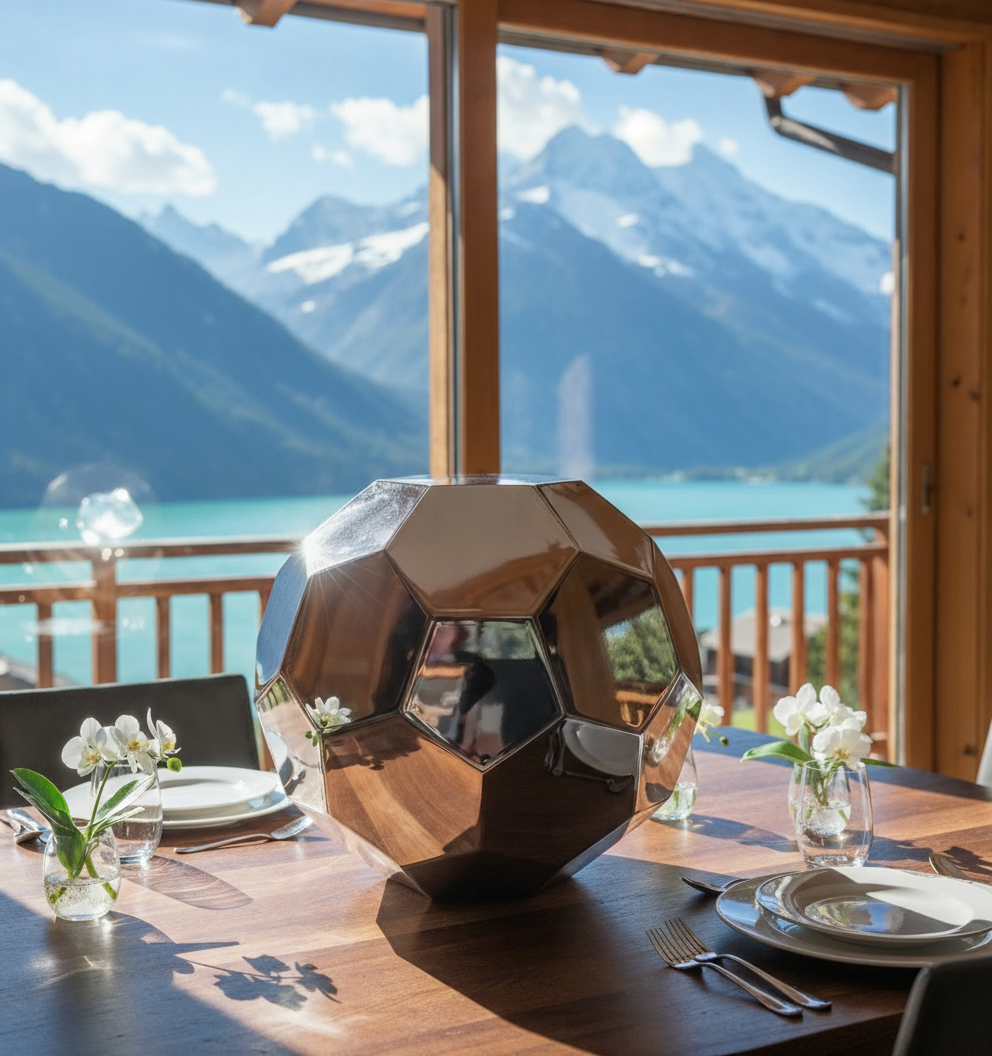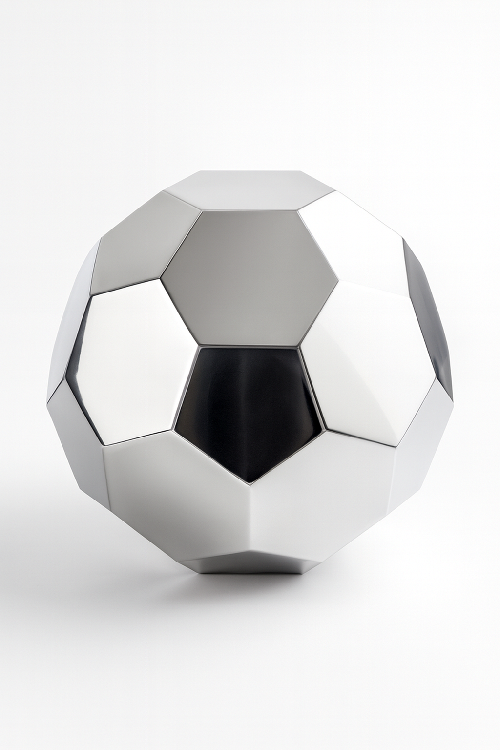 Le Ballon de Football Polygonal a été élaboré en tôle d'acier découpée au laser, pliée, soudée et polie dans différents finis qui mettent en valeur la géométrie facettée de son design. Cette pièce combine art et sport dans un objet sculptural unique.