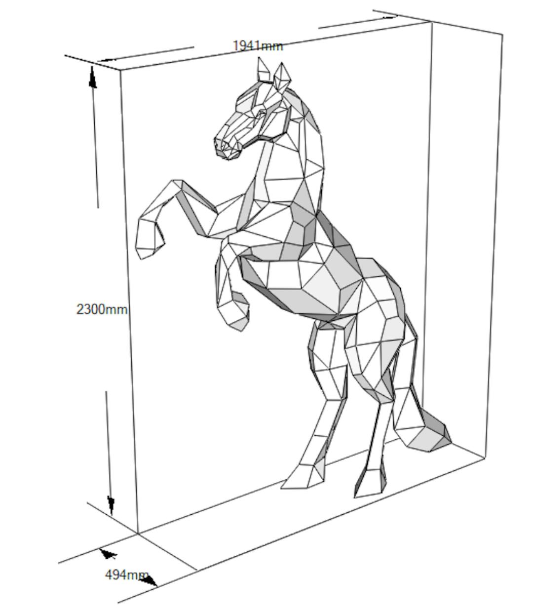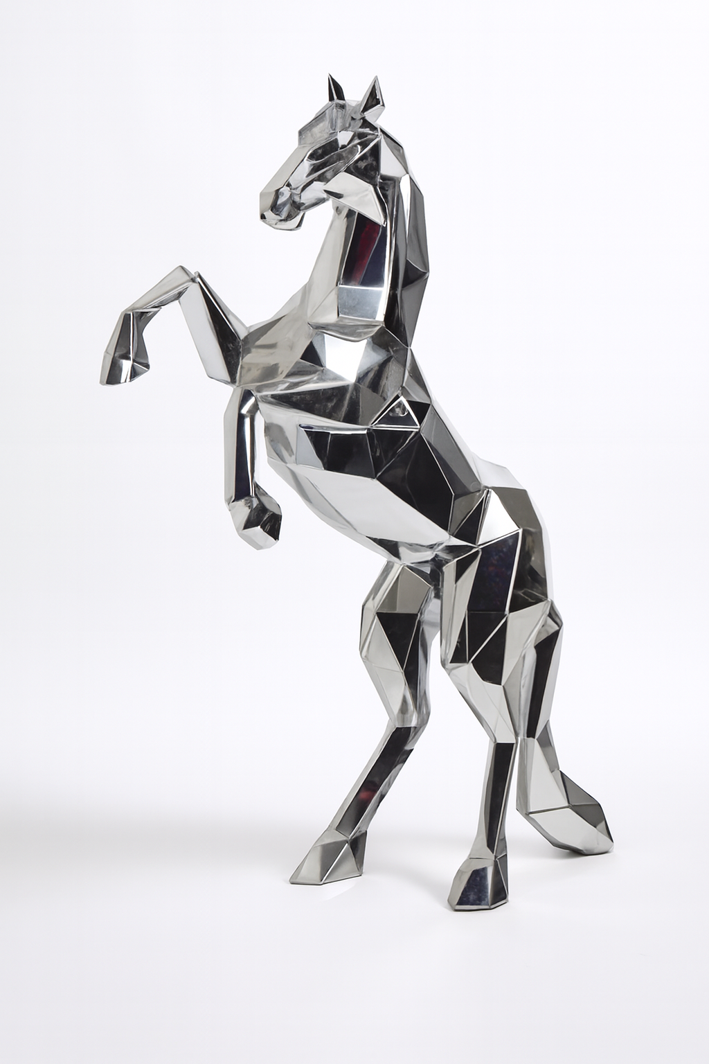 Le Cheval 185 Polygonal est fabriqué en tôle d'acier découpée au laser, pliée, soudée et polie dans des finis qui soulignent la force de sa silhouette. La sculpture transmet liberté, mouvement et noblesse.