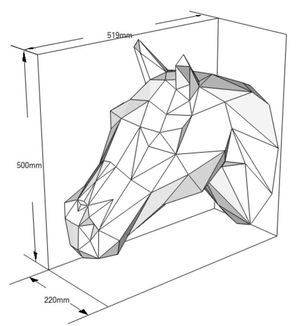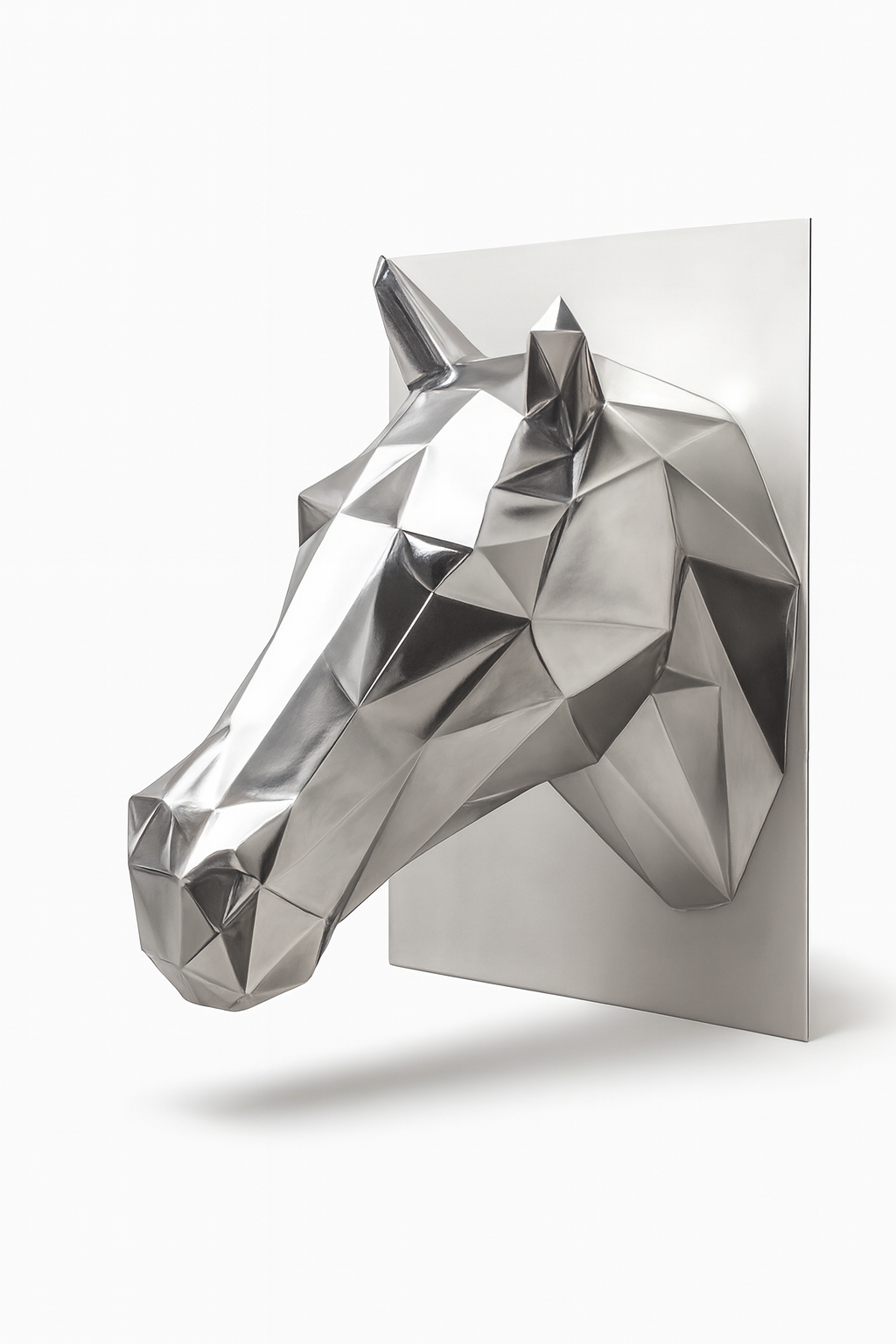 La Tête de Cheval 82 Polygonale est réalisée en tôle d'acier découpée au laser, pliée, soudée et polie avec précision, mettant en valeur chaque arête géométrique. L'œuvre transmet caractère et distinction.