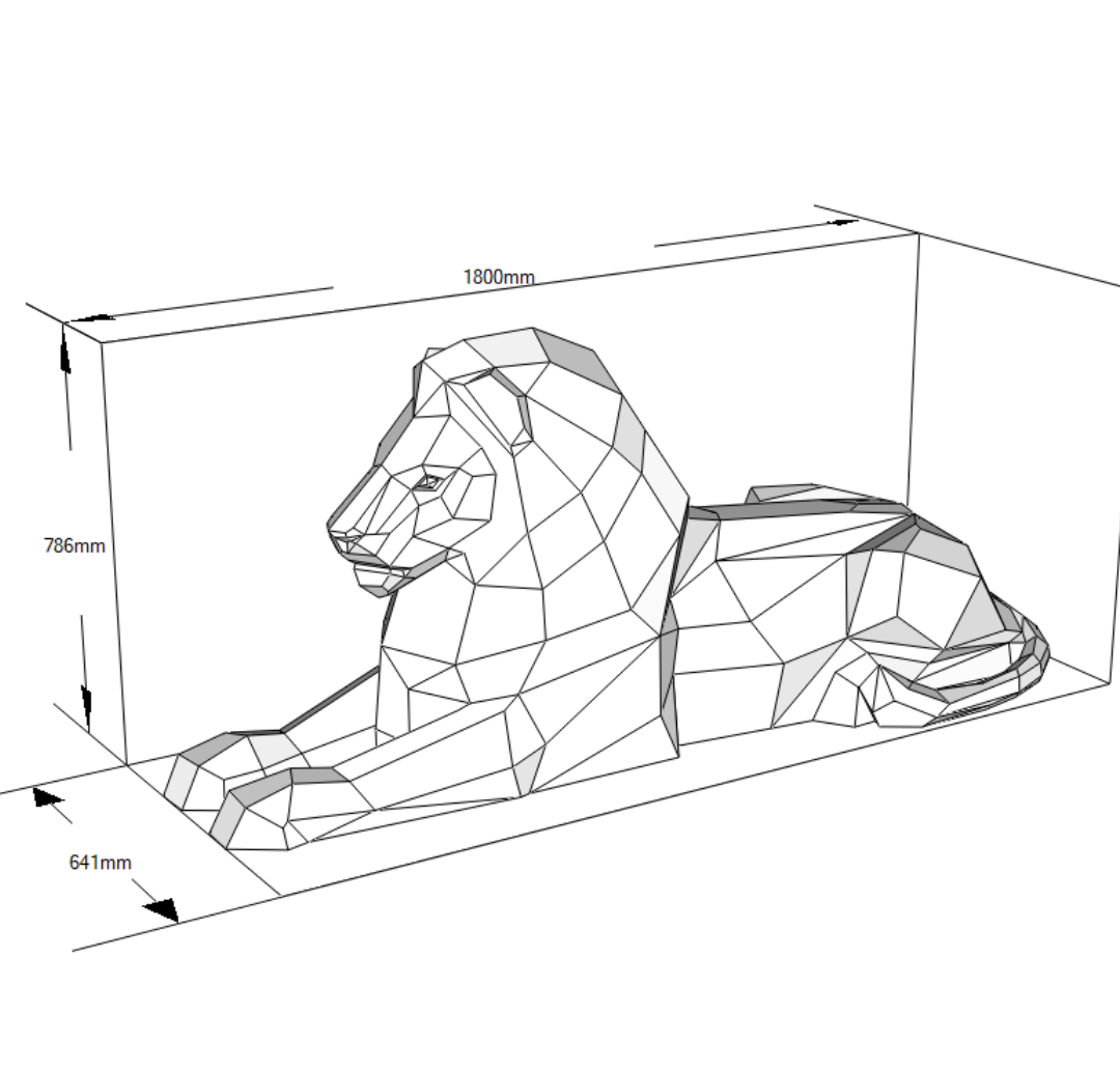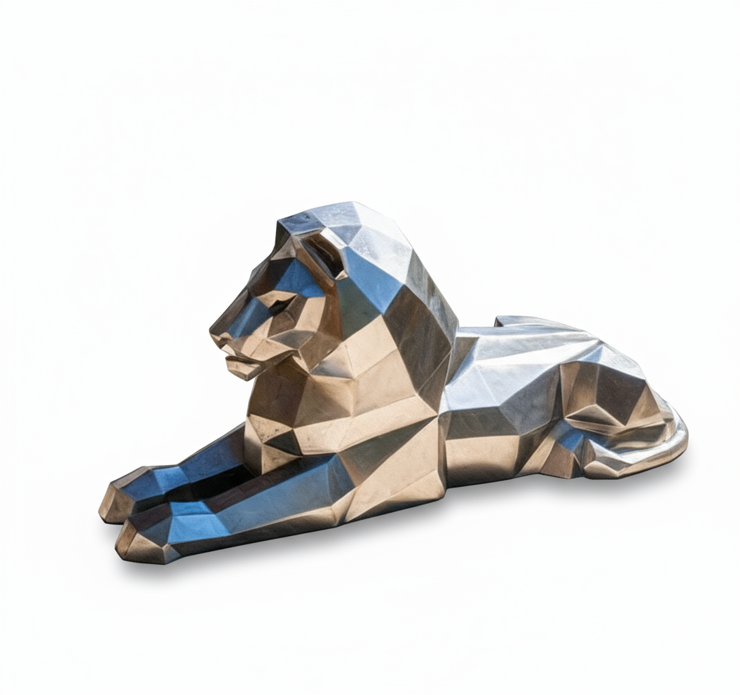 Le Lion Polygonal est fabriqué en tôle d'acier découpée au laser, pliée, soudée et polie dans différentes finitions. Ses facettes géométriques évoquent l'autorité et la tranquillité.