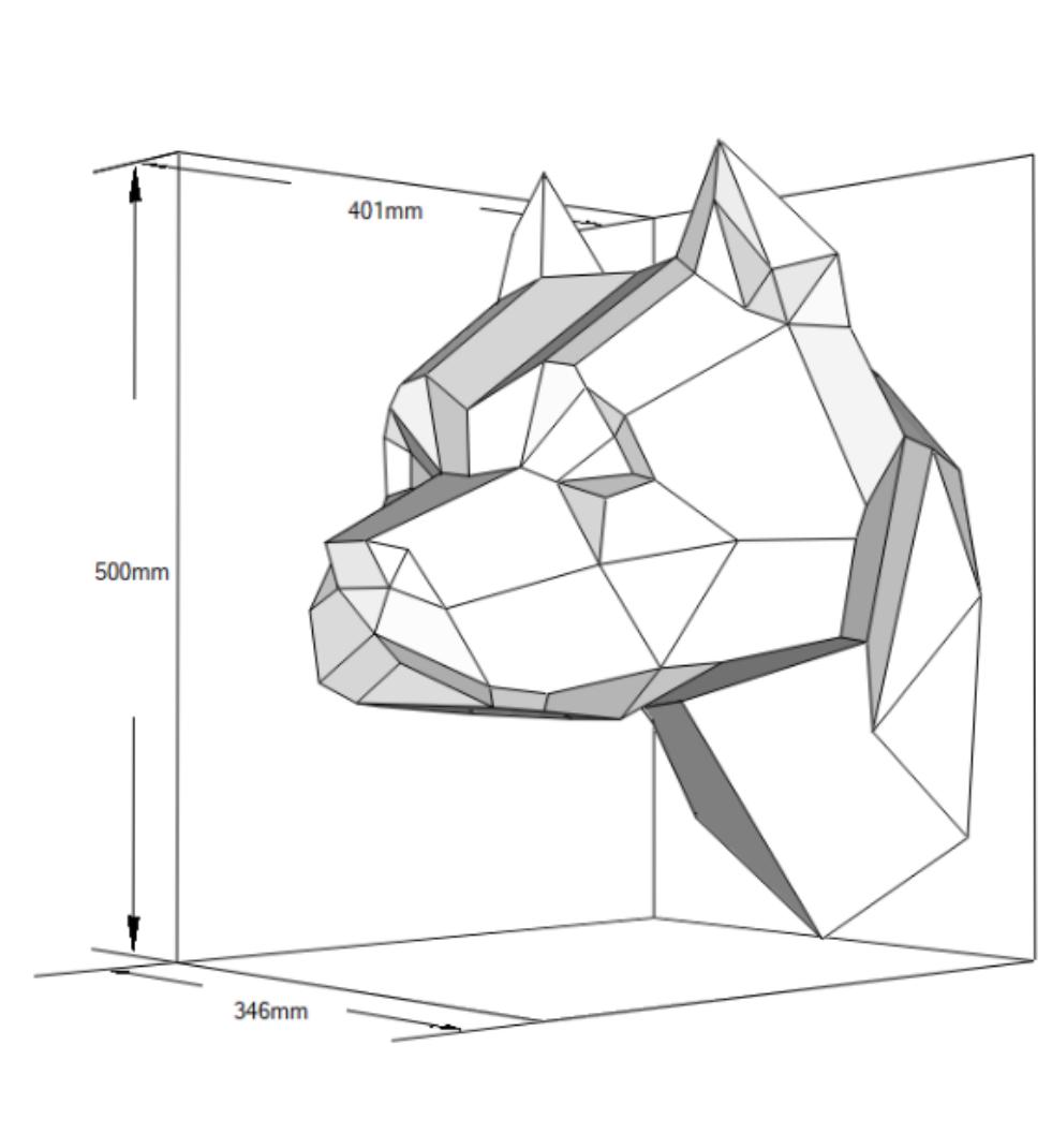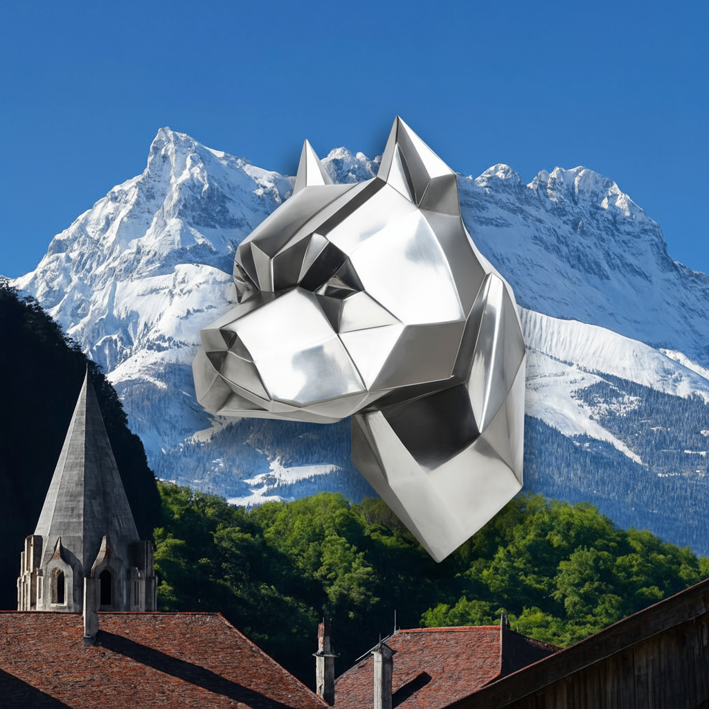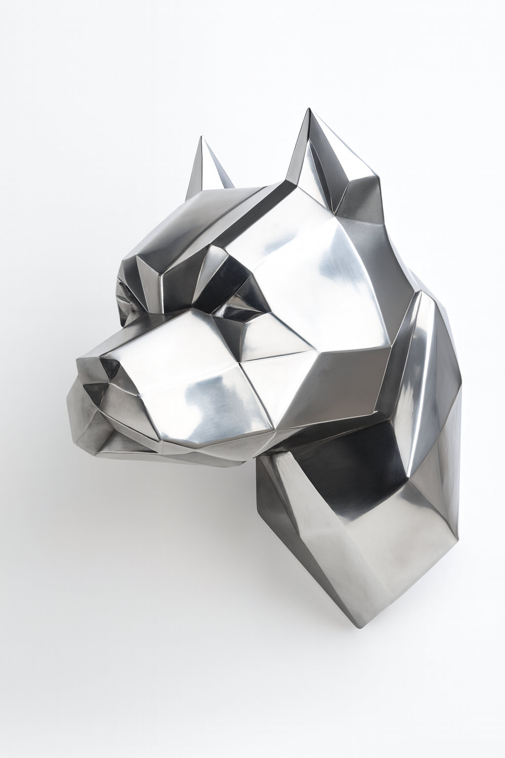 La Tête de Pitbull Polygonale a été conçue en tôle d'acier découpée au laser, pliée, soudée et polie avec des finitions raffinées qui soulignent son caractère ferme. L'œuvre concentre la puissance et l'intensité de cet animal dans un portrait géométrique imposant.